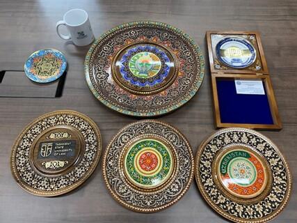 恒例のお土産交換をしたのですが、ウズベキスタンは飾り皿とほとんど決まっているようで、今回もそれでした。結構嵩張るのに、自らお持ちいただき、皆さんに一個ずついただきました。この際、いろんな大学のもののコンプリートを目指しますか。現状のコレクションの写真を添付します。大小様々、マグを一緒に入れて撮りましたのでサイズはそちらから想像ください。今回いただいたのは左下のものです。