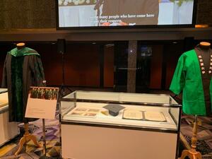 その後、豊田名誉会長のご経歴やゆかりの品々が展示されている別会場に移動、少しの時間を過ごしました。本学からも、豊田名誉会長に送ったアカデミックガウンや法被などを提供したのですが、目立つ場所に置かれていて多くの方の目を引いていました。