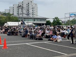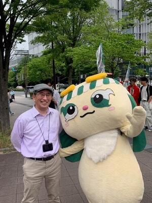 土曜日ですが、とある業務のため出勤しています。お昼ご飯を地下鉄の脇にあるコンビニに買いに行ったら、名大祭、真っ最中でした。豊田講堂の前のステージでは若い人たちのパフォーマンスが繰り広げられ、多くのお客さんが集まっていました。ようやく制限なしで実施できるということで、お揃いの赤いハッピを着た実行委員の皆さん、また参加されている学生・市民の皆さんの顔も、大変明るいものに見えました。天気が心配されましたが、なんとか今日は持ちそうで何よりです。道を歩いていたら、たまたま名大祭のマスコットのゆるキャラ「ふりゃあ」がいたので、一緒に写真をとってもらいました。近くにいた附属高校の生徒たちには総長とバレてしまいましたが、実行委員の方々は気づいていなかったと思います。