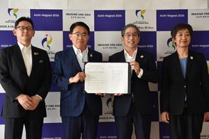 本日は、2026年に愛知・名古屋で開催予定のアジア・アジアパラ競技大会について、調印式が県庁でありました。この調印式は、愛知県の4年制の大学52大学の学長の集まりである愛知学長懇話会の下に、2026 年アジア競技大会・アジアパラ競技大会専門委員会を設置したことが契機になっています。本競技大会を学生中心に盛り上げていこう、ということで中京大学の梅村清英学長が委員長、至学館大学の谷岡郁子学長が事務局をつとめて発足し、現在は16大学が参加を表明しています。