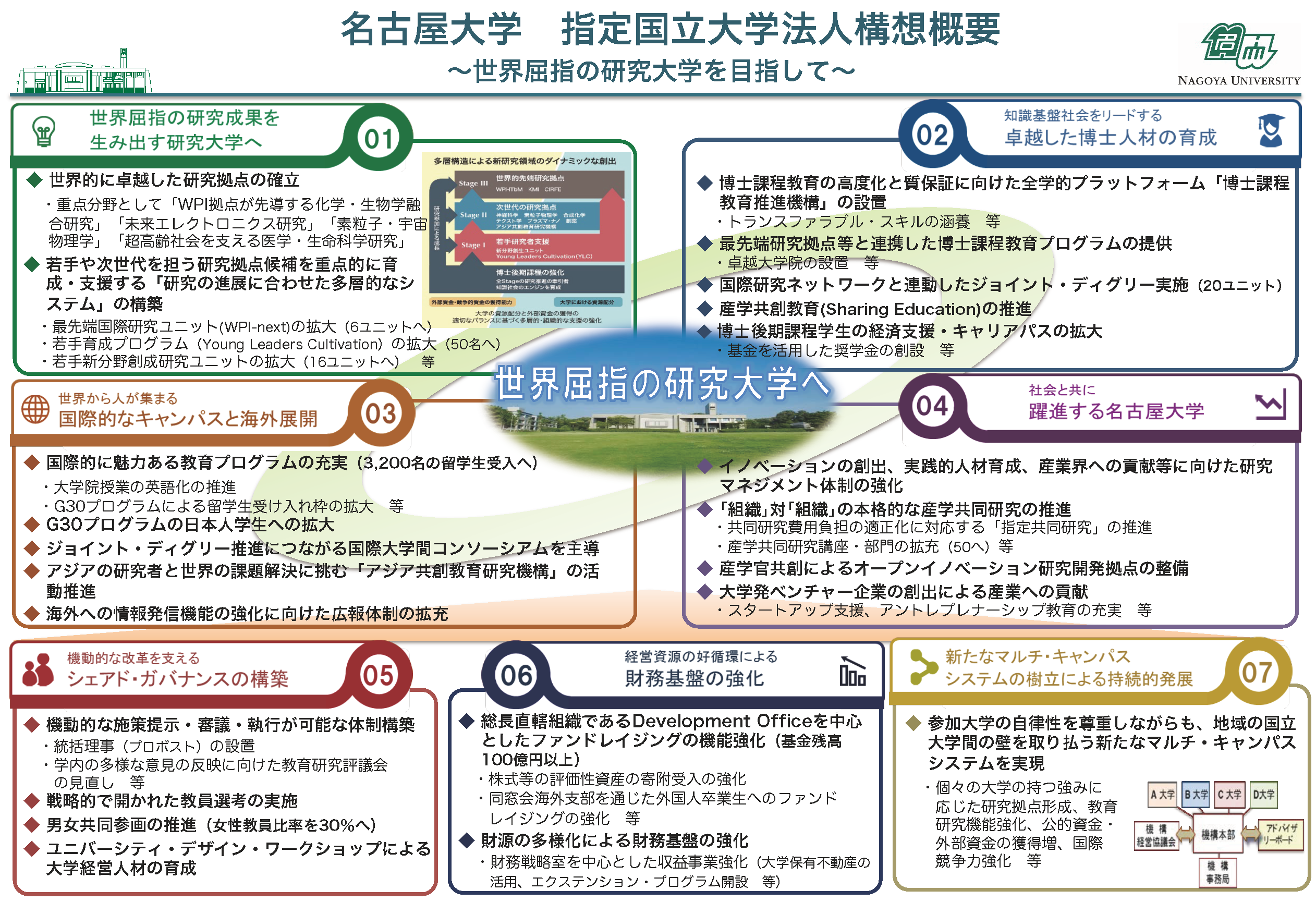 今回の指定国立大学法人への申請では、名古屋大学の強みを最大限に活かしながら、①世界最先端の研究拠点群形成、②知識基盤社会の中核となる博士人材の育成、③キャンパスの国際化と海外展開、④産業界と連携したイノベーション創出を実現するための構想を10年後の名古屋大学の姿として提示しています。また、これらの取組を支える⑤シェアド・ガバナンスによる大学運営体制の確立、⑥資源の好循環による財務基盤の強化、⑦将来に向けたマルチ・キャンパスシステムの樹立を目指すこととしております。