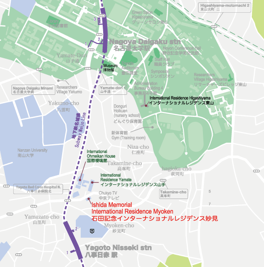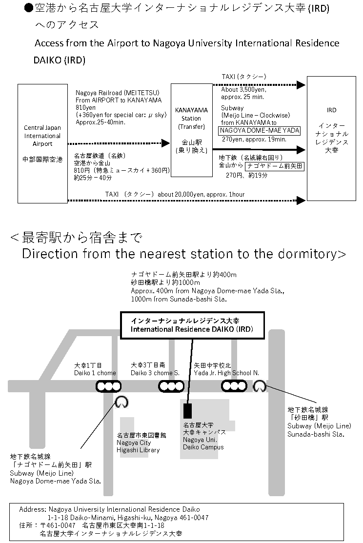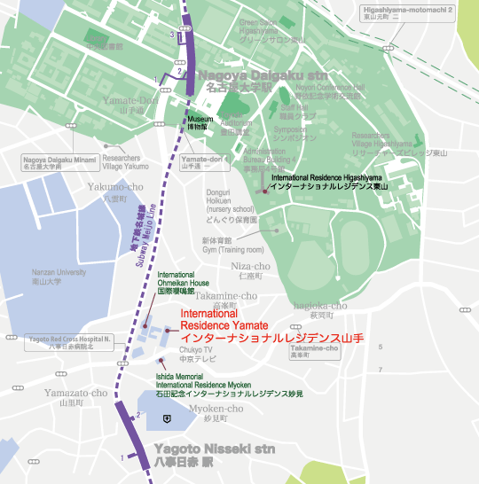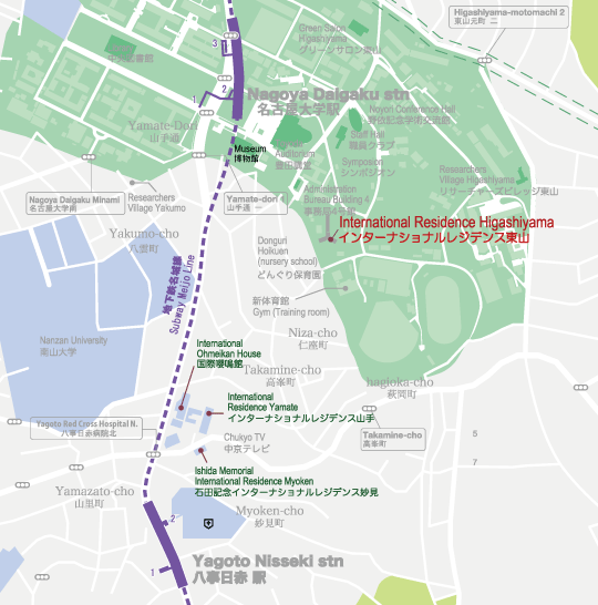 名古屋大学には外国人研究者用の宿舎として、インターナショナルレジデンス東山、リサーチャーズビレッジ東山、野依記念学術交流館、リサーチャーズビレッジ大幸及びリサーチャーズビレッジ八雲があります。入居期間は1ヶ月以上1年以内です。